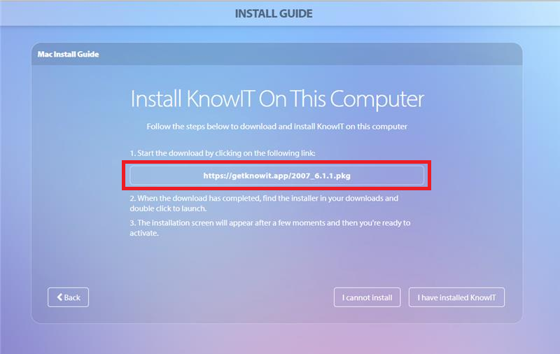 - Once the Mac restarts, log back in to your KnowIT online portal and continue to Downloading KnowIT step